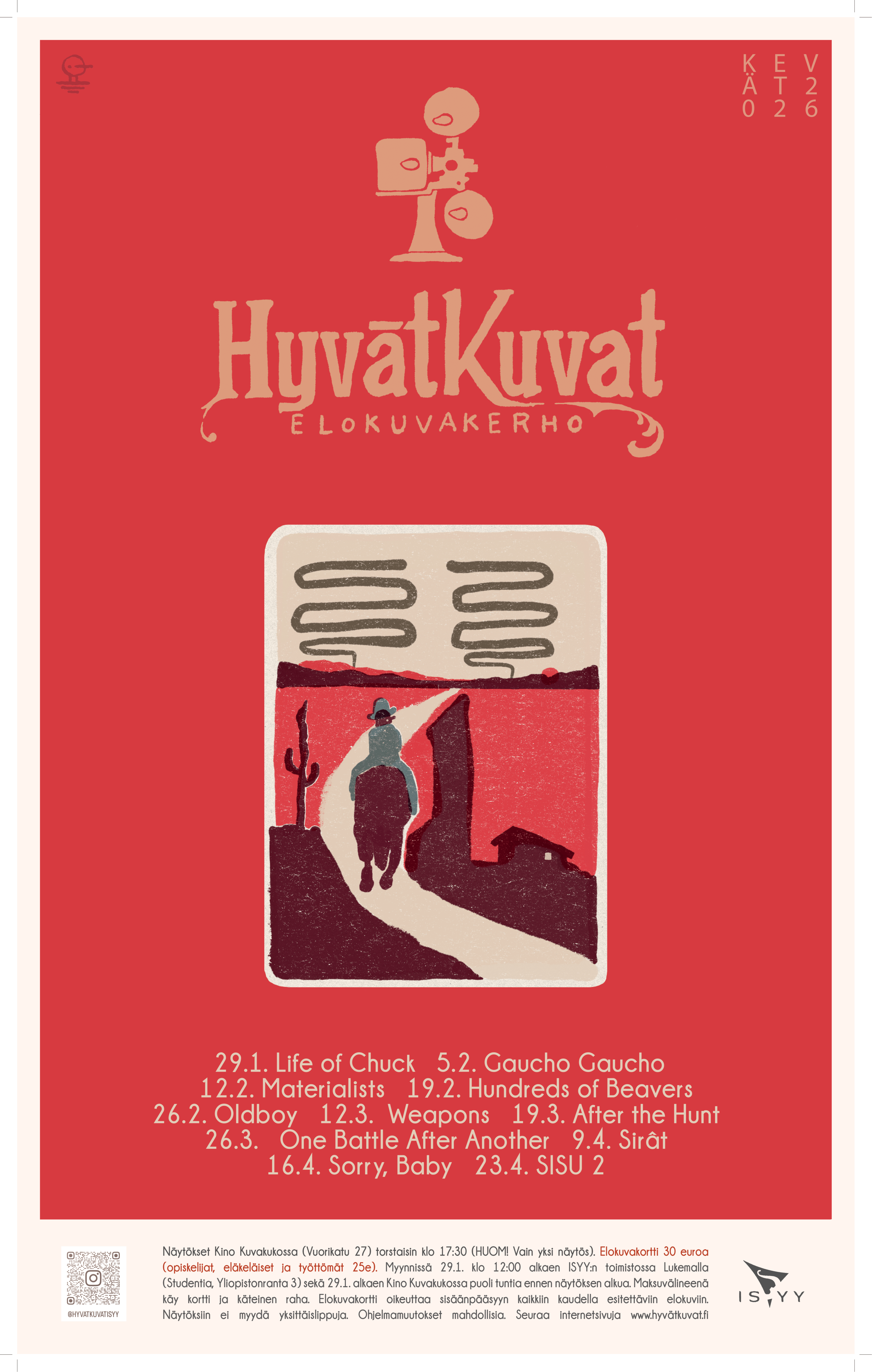 Ja tosiaan kannattaa tullakin katselemaan, koska projektorin lamppu loihtii silmiemme eteen jälleen kerran hienon valikoiman huolella valikoituja elokuvia. Toivotamme siis kaikki hyvän elokuvan ystavät tervetulleeksi Hyvät Kuvat-elokuvakerhoon, jonka jäsenyyden ja koko kauden kattavan elokuvakortin saat hintaan 30 euroa (opiskelijat, eläkeläiset ja työttömät 25 e).